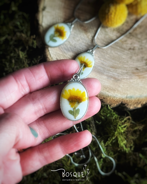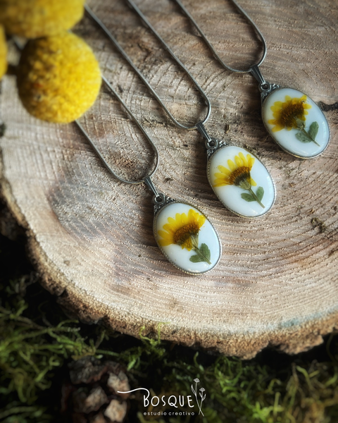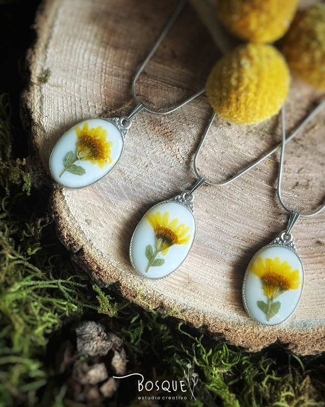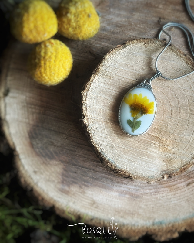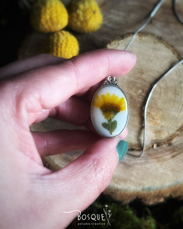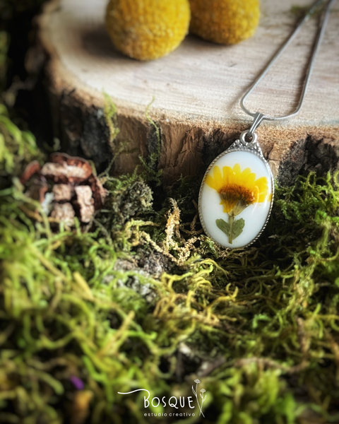 Dije ovalado en plata 950, con borde labrado sobre una base en blanco, resaltando una bella margarita amarilla prensada y preservada para mantener su color y esencia intacta.
